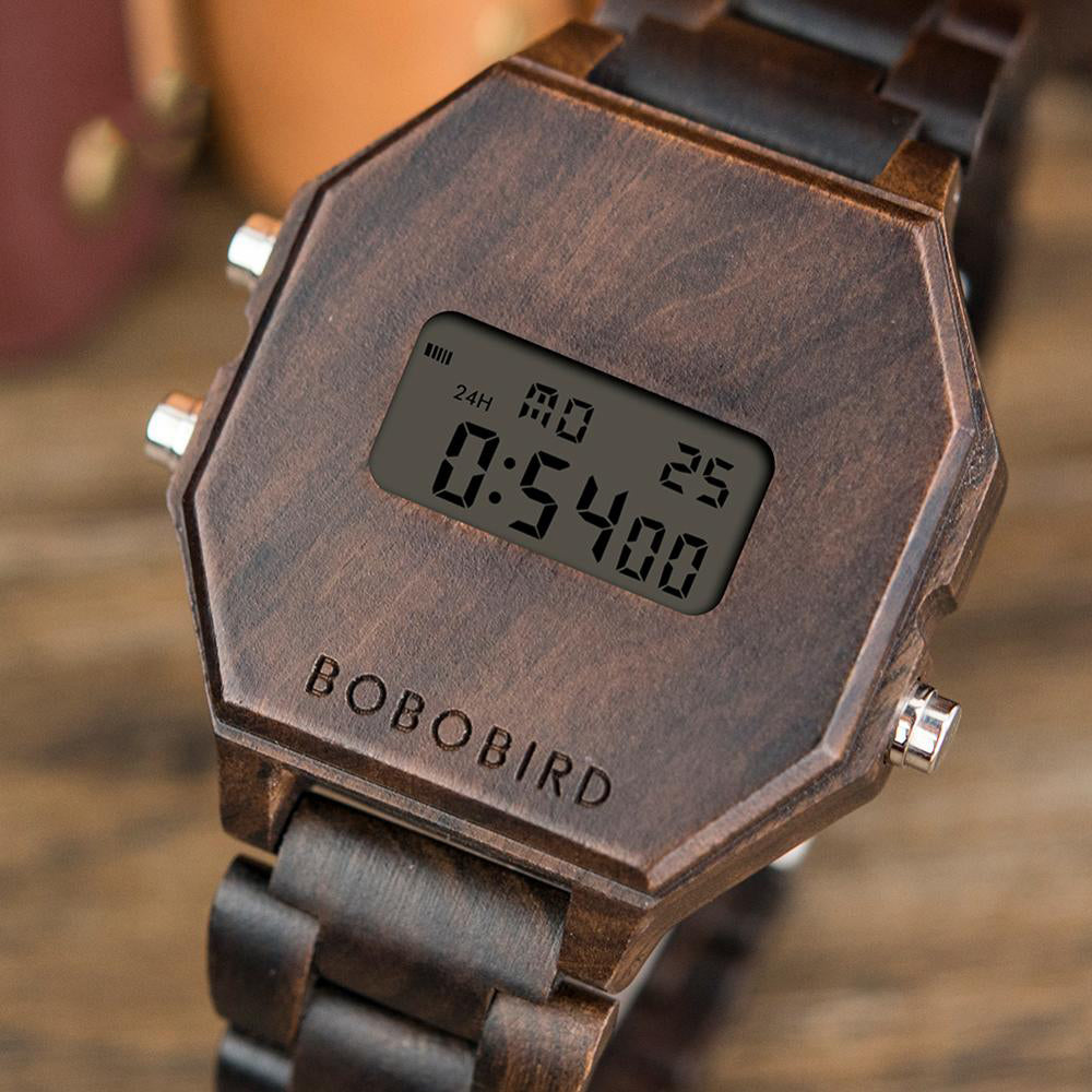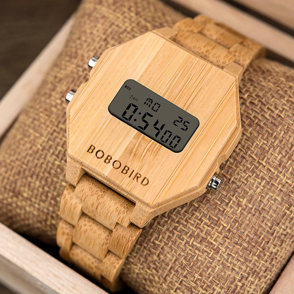 Bobo Bird Men's Bamboo Digital Wrist Watch Night Vision Lcd Unique Display