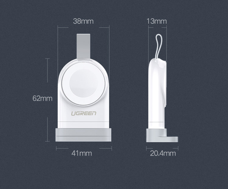 In terms of specifications, our wireless charger features a USB-A output of 5V/1A. The product size is compact, measuring 41W * 20.4D * 62H mm, ensuring that it won't take up much space in your bag or pocket.
