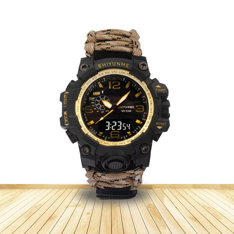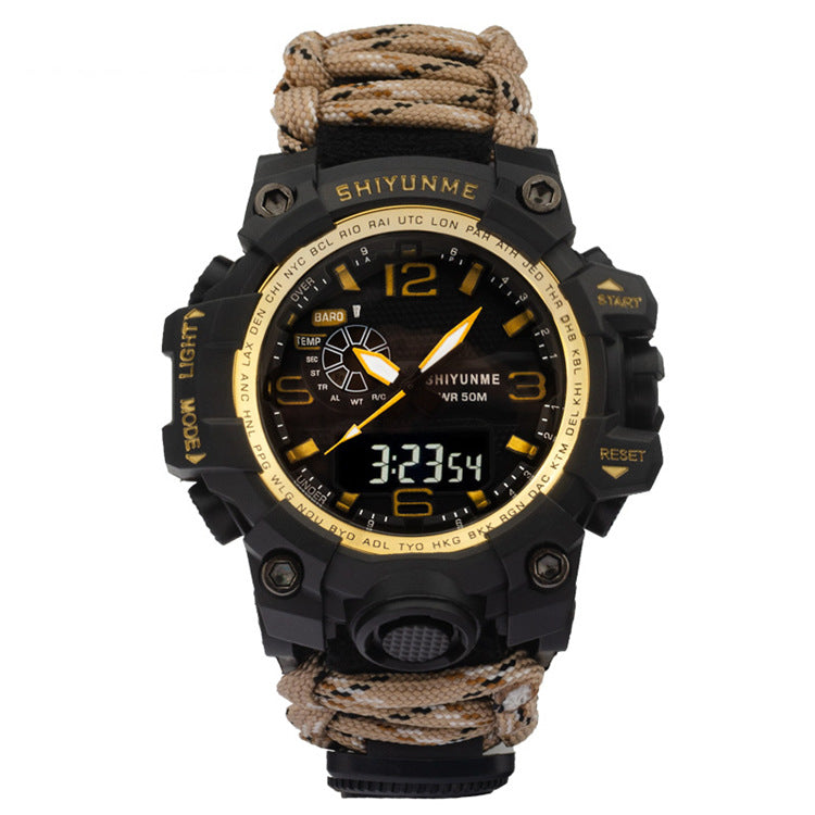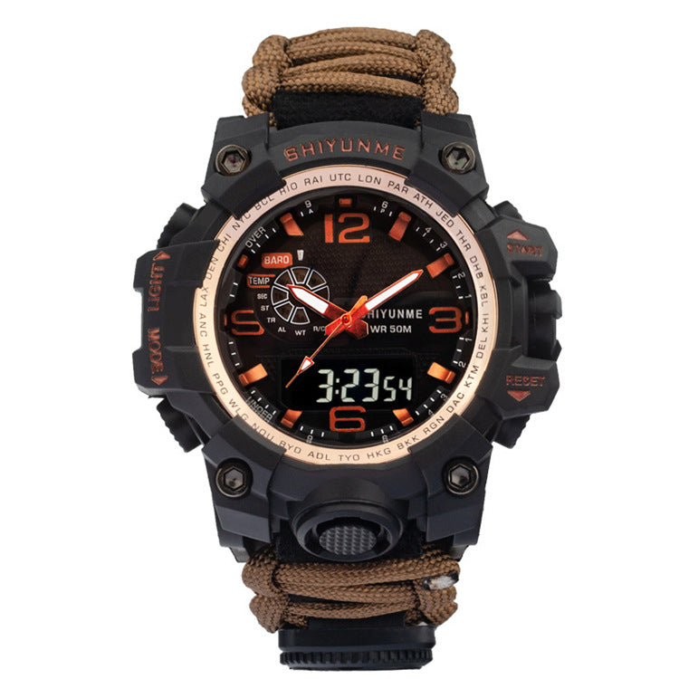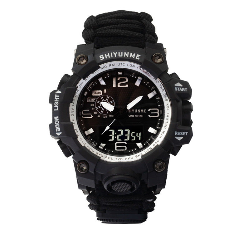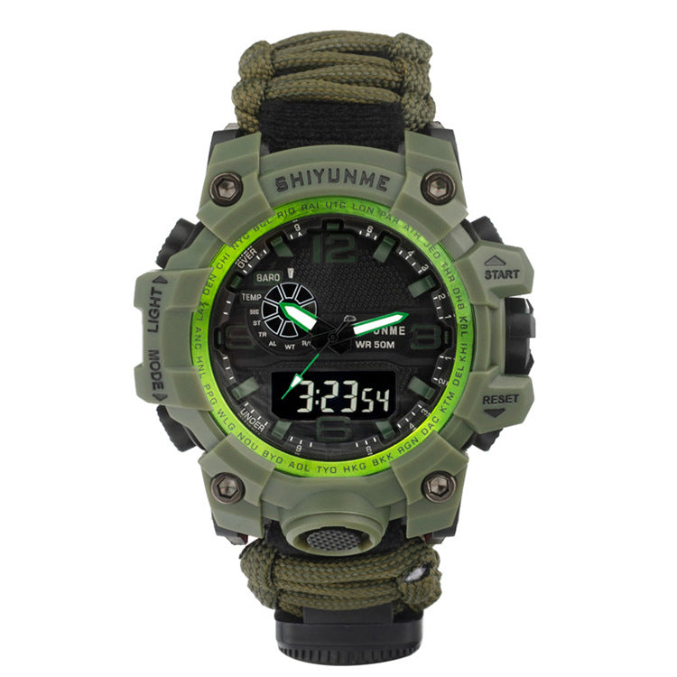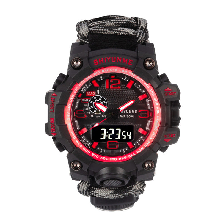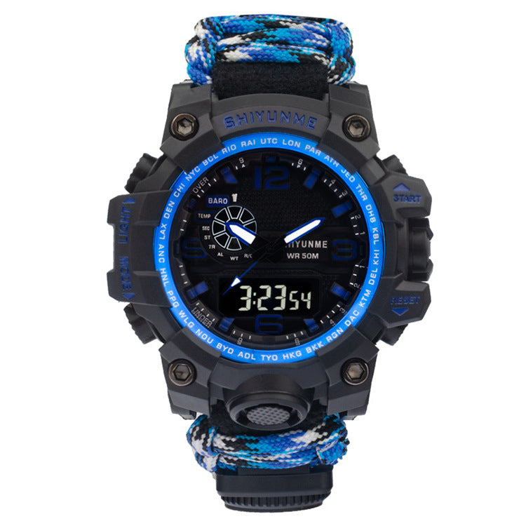 Introducing the Explosive Sports Nylon Braided Rope Watch, a must-have accessory for the adventurous souls! This model, 1509A-Nylon lifeline, is packed with special functions that cater to your outdoor needs. Equipped with a thermometer, luminous display, alarm, compass, calendar, small three-handed design, 24-hour indication, week and month display, this watch is your ultimate companion for any outdoor activity.