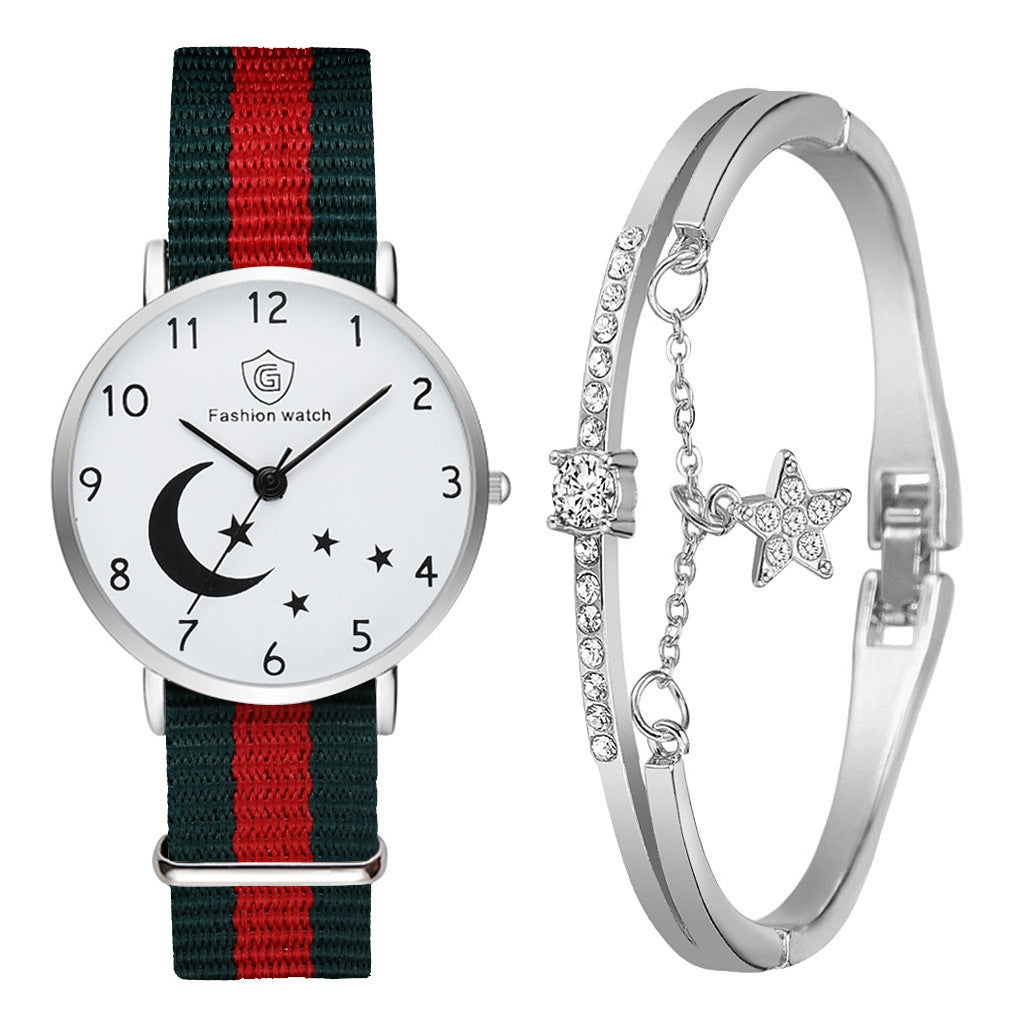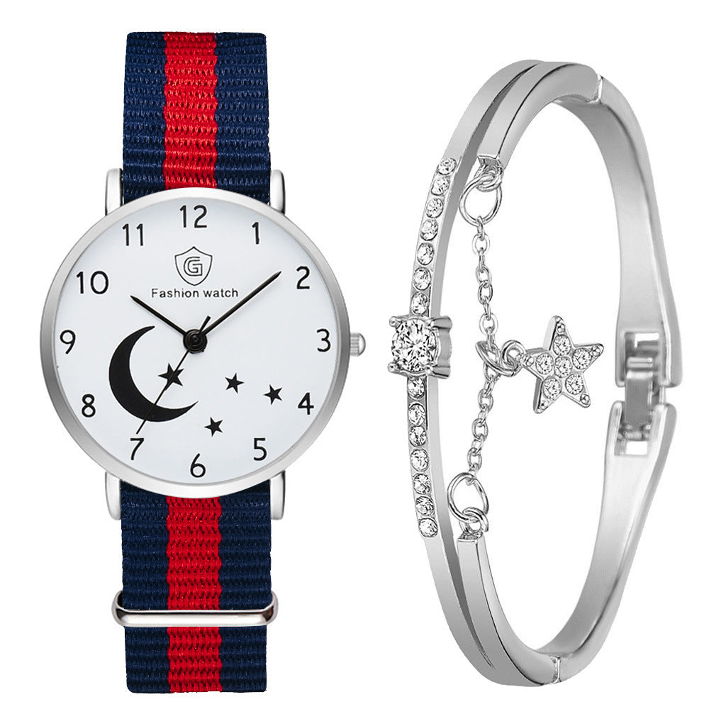 Fashion Watch For Women Bracelet Set Casual Canvas Strap Ladies Watches Moon Stars Pattern Quartz Wristwatches Female Gift Clock