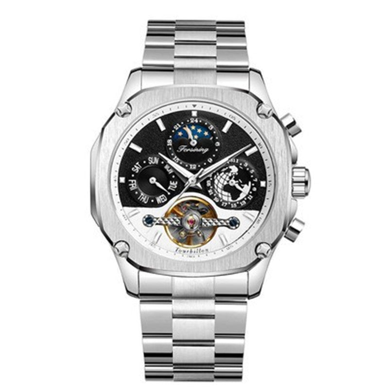Introducing the Flywheel men's automatic mechanical watch, a stylish timepiece that combines durability and functionality. Crafted with a stainless steel case, this watch is built to withstand the test of time, ensuring long-lasting performance.