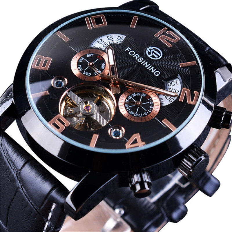 Looking for a sophisticated timepiece that combines style and functionality? Look no further than our men's automatic mechanical watch. This exquisite watch is designed with special functions including a tourbillon, calendar, and day of the week display, making it a must-have accessory for any discerning gentleman.