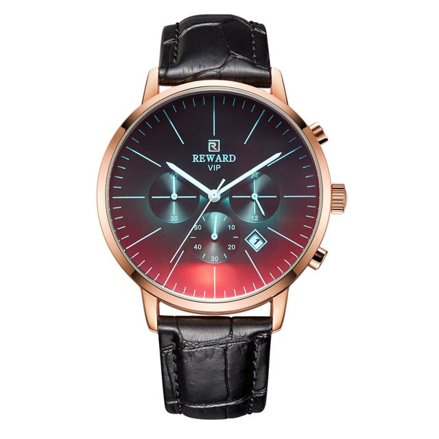 Weighing only 99 grams, the REWARD RD82004M is lightweight and comfortable to wear. The watch is powered by an imported genuine original movement, ensuring precise timekeeping. The battery is made of a Japanese original genuine battery, guaranteeing long-lasting performance. The electroplating process used in the manufacturing of this watch is done using a vacuum furnace, resulting in a durable and scratch-resistant finish. The straps are made of top layer cowhide, providing both style and durability.