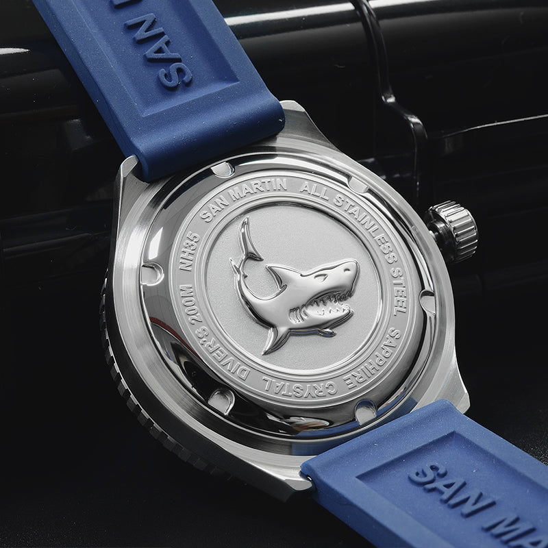 The screw-in bottom cover features a hydraulic three-dimensional shark logo, adding a unique and distinctive touch to this diving watch. The solid fine-tuning stretch diving buckle ensures a secure and comfortable fit, while the high-end rubber strap adds to the durability and flexibility of the watch.