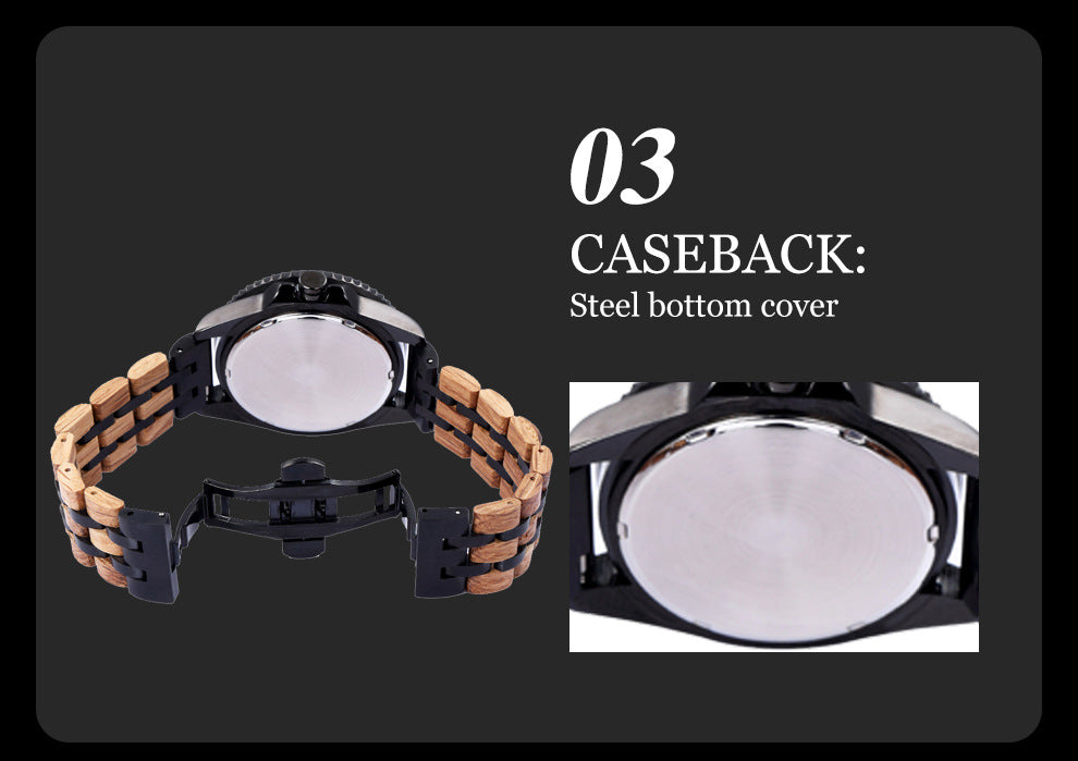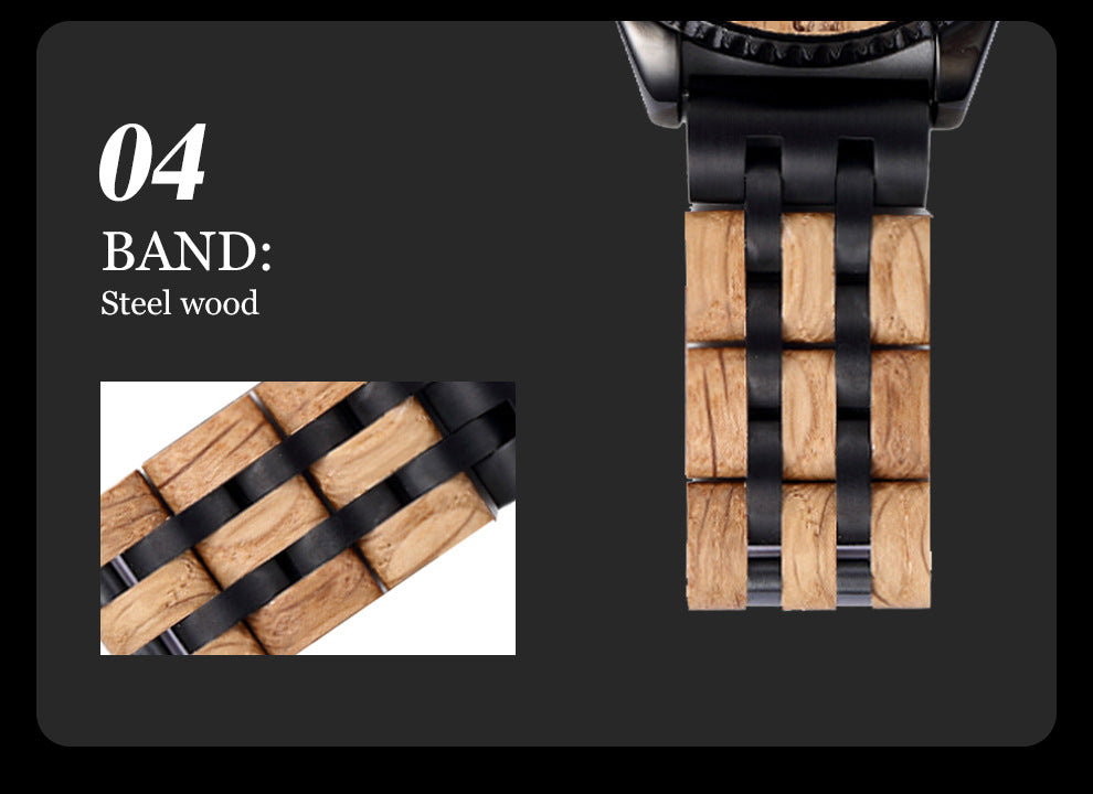 Crafted with a combination of steel and wood, this watch showcases a unique and stylish design. The black and silver color options add a touch of versatility, making it suitable for any occasion and outfit.