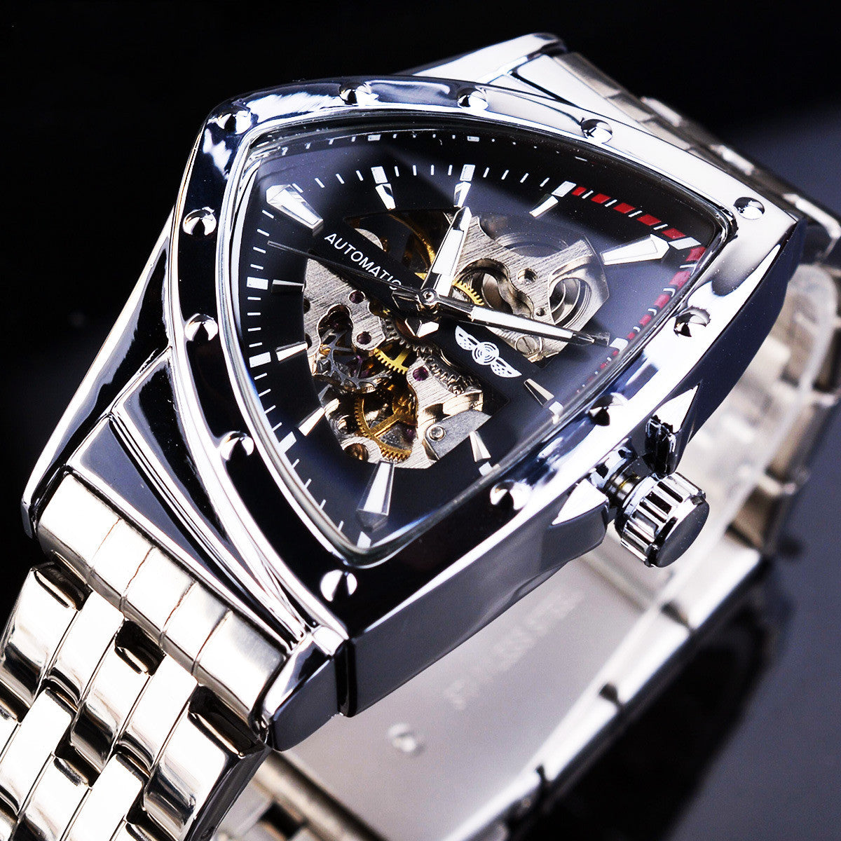 The Triangle Men's Automatic Watch Fashion features an Automatic Self-Wind movement, eliminating the need for manual winding. This allows you to effortlessly keep track of time without any hassle. The watch band is made of high-quality stainless steel, ensuring both durability and style. The stainless steel watch case further enhances the watch's overall appeal, making it a perfect accessory for any occasion.