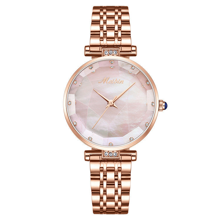 With its round dial shape and alloy case material, this watch exudes a timeless appeal. Available in four stunning color options - A rose gold shell white shell noodles, B rose gold shell powder noodles, C rose gold shell malachite green noodles, and D rose gold shell black shell noodles - you can choose the one that best suits your personal style.