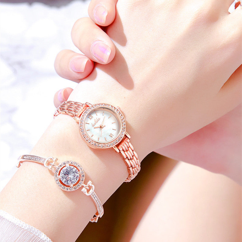 This gift box set includes not only the watch but also a matching bracelet, necklace, ring, and a pair of earrings. It's the perfect all-in-one package for gifting or treating yourself. Each piece in this set is carefully crafted to complement each other, creating a cohesive and fashionable look.