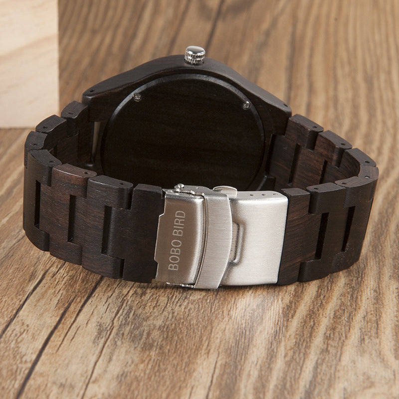 The clasp style of this watch is a bilateral press buckle, providing a secure and comfortable fit on your wrist. The wooden strap adds a touch of sophistication and adds to the overall aesthetic appeal of the watch.